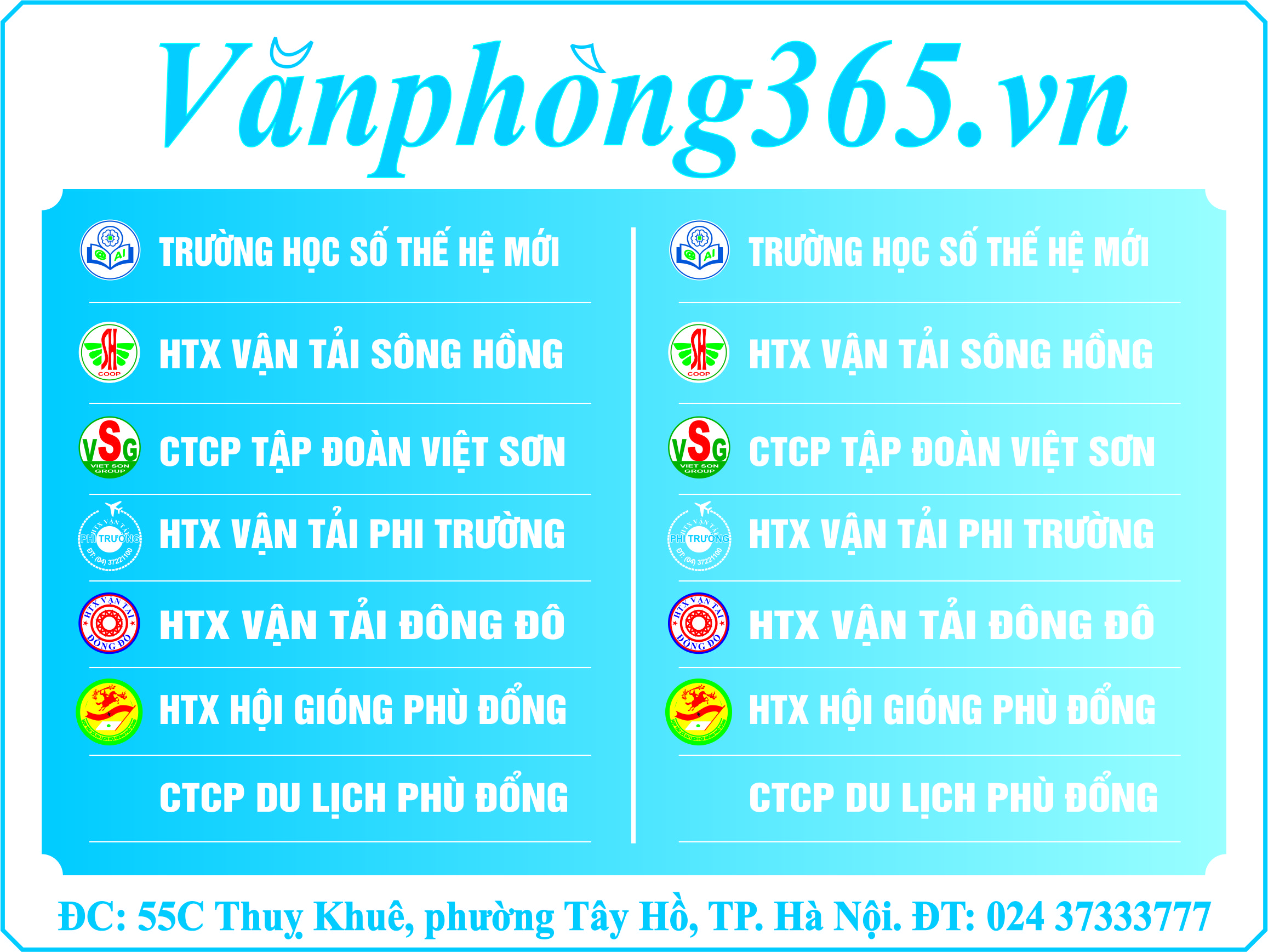 Vanphong365.vn là đơn vị cung cấp giải pháp văn phòng linh hoạt – trọn gói tại trung tâm Thủ đô Hà Nội, đáp ứng đa dạng nhu cầu của doanh nghiệp, tổ chức, cá nhân khởi nghiệp và hoạt động đào tạo.